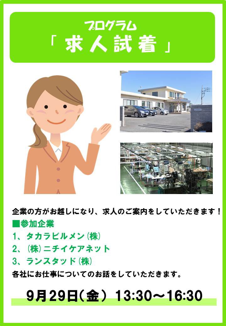 かしわサポステプログラムで、求人試着を開催します。 今回は、タカラビルメン㈱さん、㈱ニチイケアネットさん、ランスタッド㈱さんが来所し、 仕事内容のお話とともに、求人案内をしていただきます。 企業の方から具体的なお話が聞け、質問もできる絶好の機会です。 ぜひご参加ください! 日時:9月29日(金) 13:30~16:30 場所:かしわサポステ 小会議室